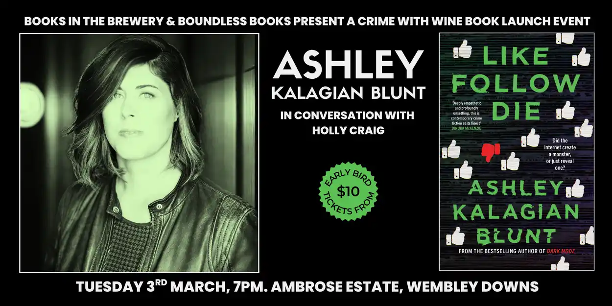 Books in the Brewery and Boundless Books are proud to present an exclusive Crime with Wine book launch party at the stunning Ambrose Estate in Wembley Downs. Join us for a thrilling evening celebrating the release of Ashley’s pulse-pounding new novel, Like, Follow, Die.